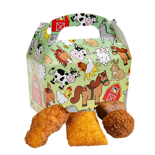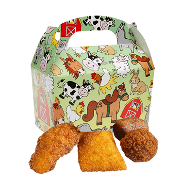 Frietjes, 4 x kipnuggets, 4 x mini frikandellen, 4 x mini kaassoufflé of 4 x bitterballen, appelmoes, saus naar keuze en een kleine verrassing
