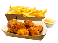 8 luxe kipnuggets met chilimayonaise, frietjes, saus naar keuze & huzarensalade