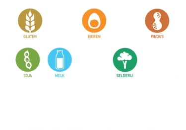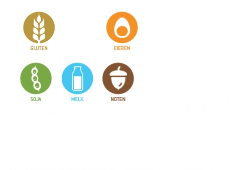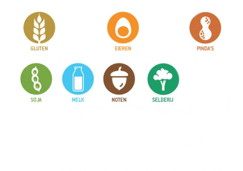 Ei, gluten, melk, noten, pinda's, selderij en soja