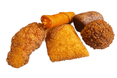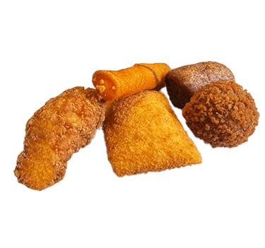 Frietjes, 4 x kaassoufflé, 4 x mini frikandellen, 4 x bitterballen of 4 x kipnuggets, appelmoes, saus naar keuze & een kleine verrassing