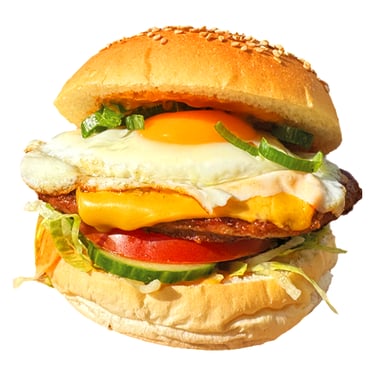 Runderburger, sla, komkommer, tomaat, cheddar, bos uitjes, gebakken ei & burgersaus