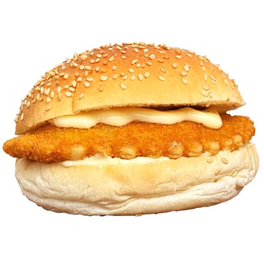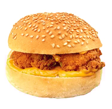 Kipburger, sla, tomaat, bacon, komkommer, cheddar, rode uitjes & BBQ-saus