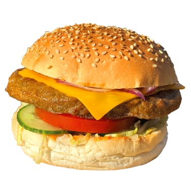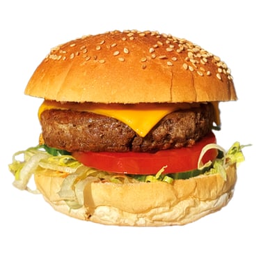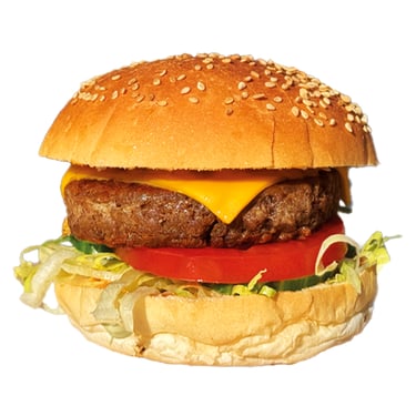 Halal burger, sla, komkommer, tomaat, cheddar, rode uitjes & burgersaus