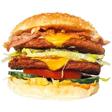 Twee runderburgers, sla, komkommer, tomaat, cheddar, dubbel cheddar, bacon, uitjes & burgersaus